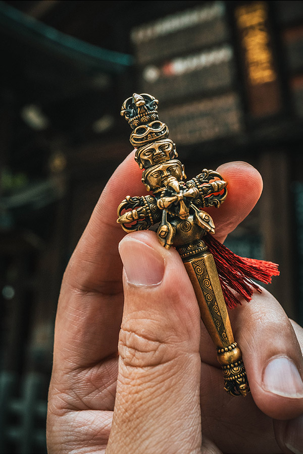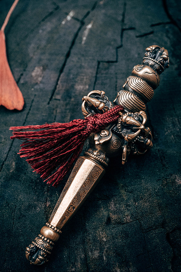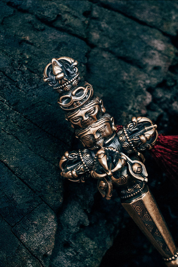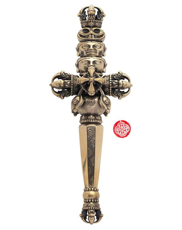 天杖頂部自上向下飾有金剛杵、骷髏頭、萎人頭、鮮人頭三佛首,代表佛之過去現在和未來三身,即法身、應身、化身。三佛首下鑄飾十字金剛杵和寶瓶,寶瓶下爲喀章嘎柱形大杖,杖杆八面,像徵佛陀的「八正道」,上粗下細表面刻有紋飾,底端裝飾金剛杵,與頂部爲之呼應。