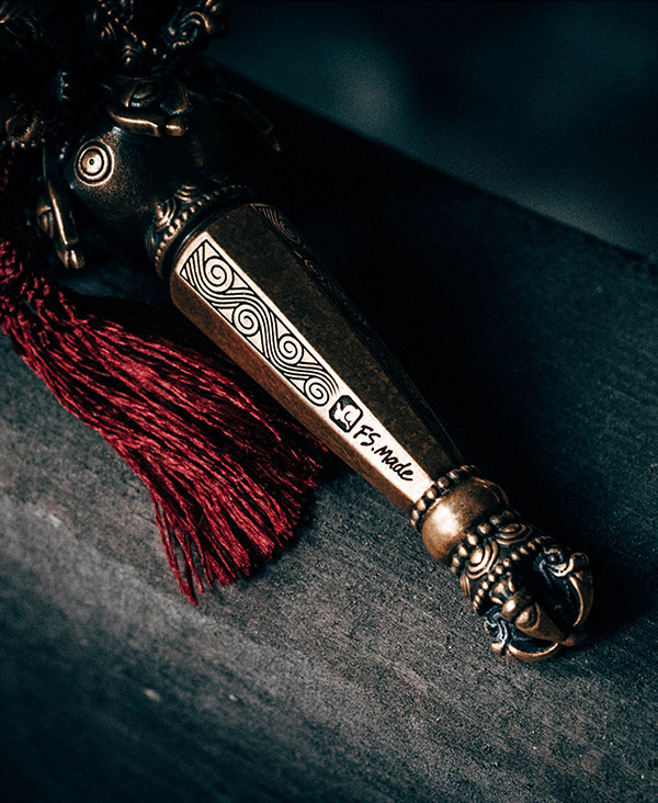 本作品是FS MADE依據天杖的傳承如法形制,加入當代的視覺造形表現風格設計而成。規格大小設定爲「單手可握於掌心」,便於日常的隨身攜帶和把玩,體會歲月流逝物件在您手中氧化、舊化而產生的自然舊化美感。